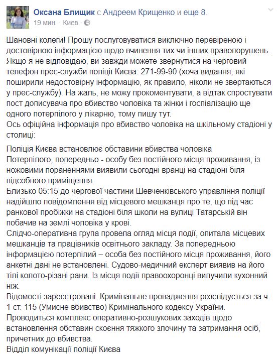 Полиция Киева устанавливает обстоятельства убийства мужчины. Предварительно - это лицо без определенного места жительства, его с ножевыми ранениями обнаружили сегодня утром на стадионе возле подсобного помещения. Около 5:15 в дежурную часть Шевченковского управления полиции поступило сообщение от местного жителя о том, что во время утренней пробежки на стадионе возле школы на улице Татарской он увидел на земле мужчину в крови. Следственно-оперативная группа провела осмотр места происшествия, опросила местных жителей и работников образовательного учреждения. Судебно-медицинский эксперт обнаружил на его теле колото-резаные раны. С места происшествия правоохранители изъяли кухонный нож. Уголовное производство расследуется по ч. 1 ст. 115 (Умышленное убийство) Уголовного кодекса Украины. Проводится комплекс оперативно-розыскных мероприятий по установлению обстоятельств совершения тяжкого преступления и задержанию лиц, причастных к убийству", - написала Блищик.