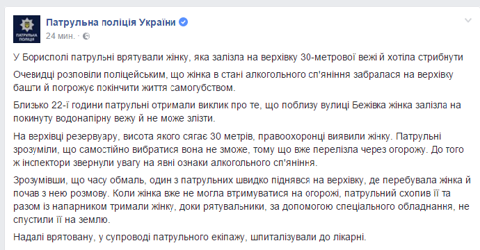 В Борисполе Киевской области патрульные полицейские спасли женщину, которая залезла на вершину 30-метровой башни и хотела спрыгнуть оттуда, решив покончить жизнь самоубийством. Об этом сообщается на странице патрульной полиции в Facebook.