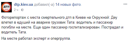 В Киеве на Окружной произошло смертельное ДТП. Daewoo влетел в грузовик Tata, который ехал с включенной аварийкой. Об этом сообщает dtp.kiev.ua на странице в Facebook.