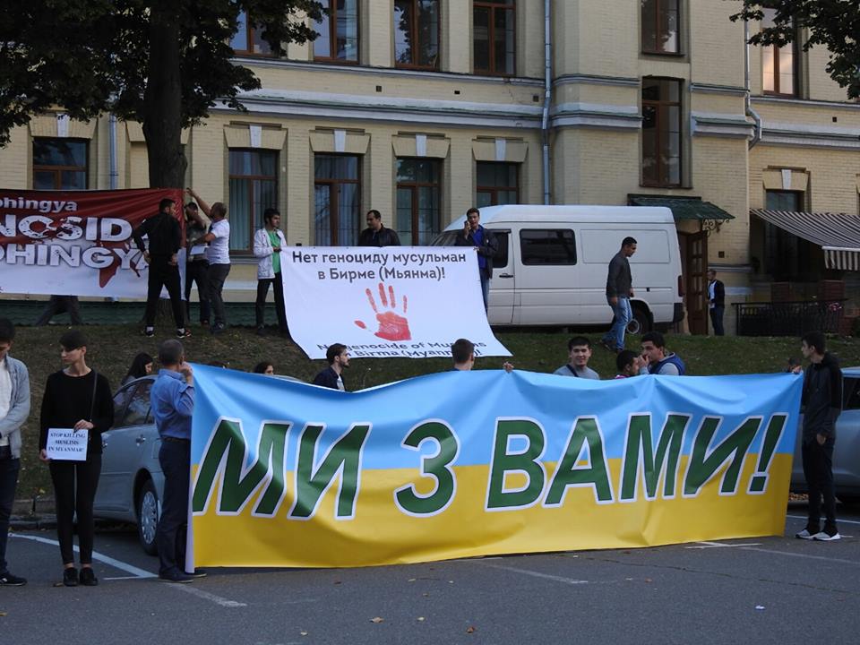 Вечером около 19:00 в Киеве под зданием МИД Украины началась акция в поддержку мусульман Мьянмы, которые вступили в столкновения с правительственными войсками