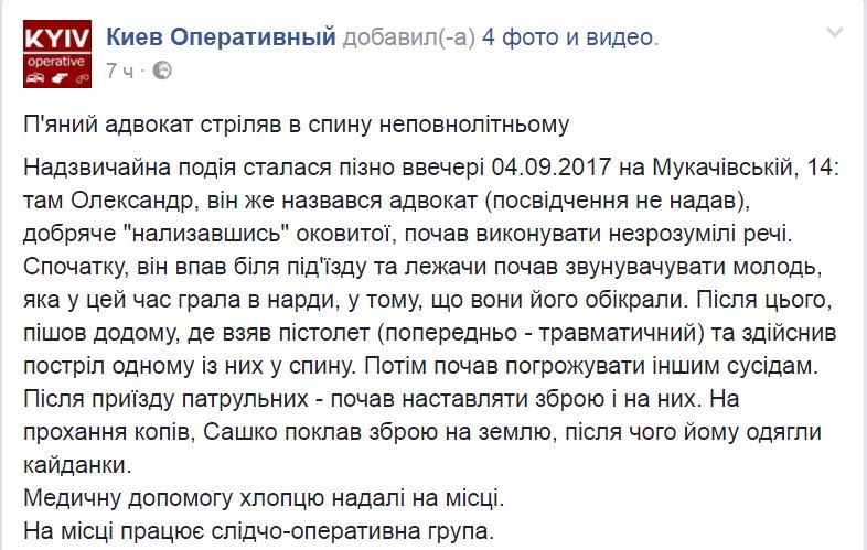 В Киеве поздно вечером 4 сентбря пьяный мужчина, назвавшийся адвокатом, выстрелил в спину несовершеннолетнему. Об этом сообщает "Киев. Оперативный" на своей странице в Facebook.