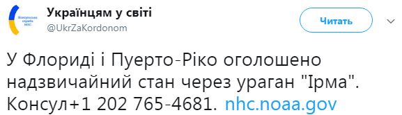 "Во Флориде и Пуэрто-Рико объявлено чрезвычайное положение из-за урагана "Ирма". Консул +1 202 765-4681", - говорится в сообщении.