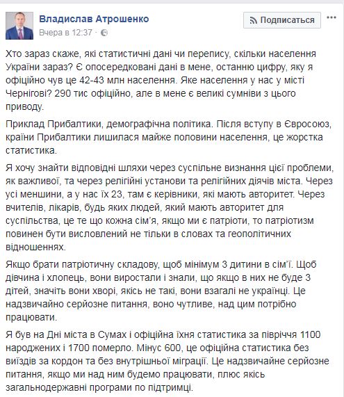 "Кто сейчас скажет, какие статистические данные или переписи, какова численность населения Украины сейчас? Есть косвенные свидетельства у меня, последнюю цифру, которую я официально слышал это 42-43 млн населения. Какое населения у нас в городе Чернигове? 290 тыс. официально, но у меня есть большие сомнения по этому поводу. Пример Прибалтики, демографическая политика. После вступления в Евросоюз, страны Прибалтики лишились почти половины населения, это жесткая статистика", - написал он.