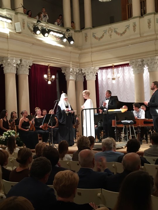 Патриарх Филарет вручил певице, которая вышла к зрителям в ослепительно белом платье, орден святой великомученицы Варвары. Об этом сообщает корреспондент "Страны" с места события.