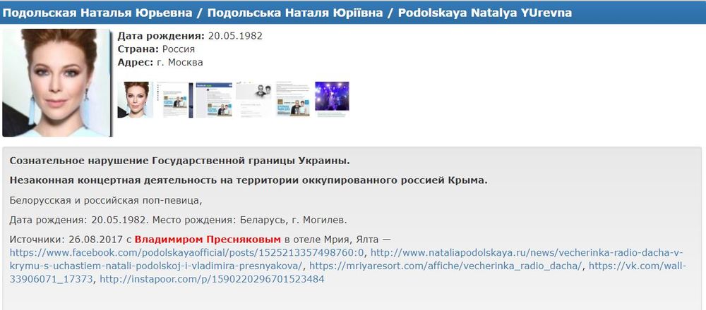 Как утверждается, супруга певца Владимира Преснякова попала в список за "сознательное нарушение государственной границы Украины" и за "незаконную концертную деятельность" в Крыму.
