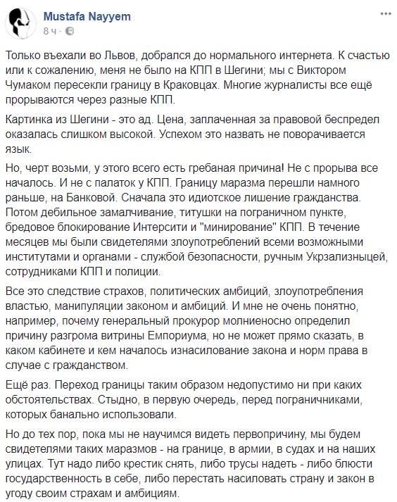 "Картинка прорыва в "Шегини" – это ад. Цена, заплаченная за правовой беспредел, оказалась слишком высокой. Успехом это назвать не поворачивается язык. Но, черт возьми, у этого всего есть гребаная причина! Не с прорыва все началось. И не с палаток у КПП. Границу маразма перешли намного раньше, на Банковой. Сначала это идиотское лишение гражданства. Потом это дебильное замалчивание, титушки на пограничном пункте, бредовое блокирование "Интерсити" и "минирование" КПП. В течение месяцев мы были свидетелями злоупотреблений всеми возможными институтами и органами – службой безопасности, ручной "Укрзалізницею", сотрудниками КПП и полиции", – отметил Найем.