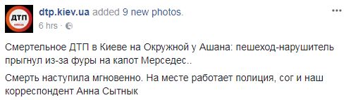 Как передает портал dtp.kiev.ua, на Окружной дороге у Ашана пешеход-нарушитель "прыгнул" из-за фуры на капот Mercedes.