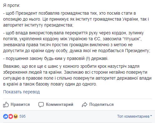 Мэр Львова, лидер партии "Самопомощь" Андрей Садовой призвал власти и прорвавшегося через границу экс-губернатора Одесской области "сделать шаги навстречу друг другу".  Об этом Садовой написал в Facebook.