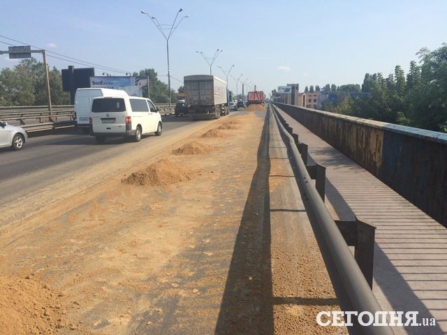 В Киеве движение на Южном мосту заблокировала груда просыпавшегося комбикорма