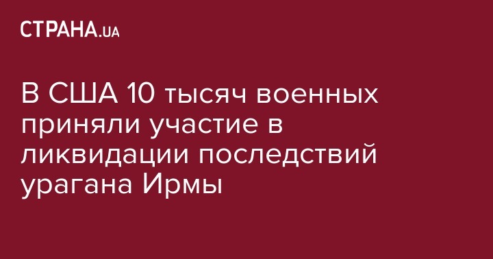 Около 10 тысяч военнослужащих приняли участие в ликвидации последствий урагана Ирма. Об этом говорится в заявлении представителя сухопутных сил ВС США Патрика Сейбера, пишут "РИА Новости".