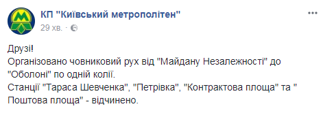 20:03 "Это жесть! Ехала с Олимпийской к Льва Толстого 25 мин, 20 мин - стояли на перегоне. "Пользуйтесь другими видами транспорта. По техническим причинам движение электропоездов ограничено", - объявляют в метро. Пассажиры немного паникуют. От Майдана до Теремков поезда не ездят !!! По направлению к Героев Днепра едут только до Майдана !!!", - пишет в Facebook журналистка Ольга Омельянчук.