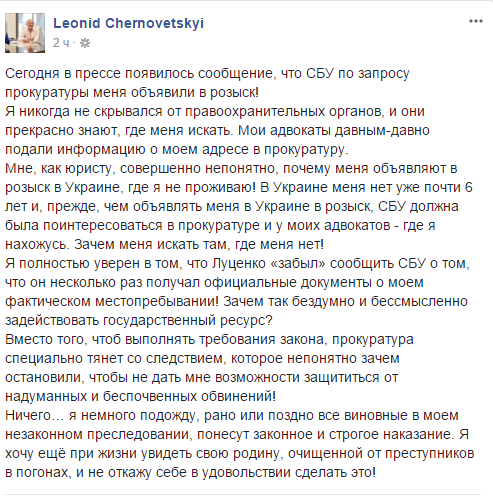 "Мне, как юристу, совершенно непонятно, почему меня объявляют в розыск в Украине, где я не проживаю! В Украине меня нет уже почти 6 лет и, прежде, чем объявлять меня в Украине в розыск, СБУ должна была поинтересоваться в прокуратуре и у моих адвокатов - где я нахожусь. Зачем меня искать там, где меня нет", - написал он.