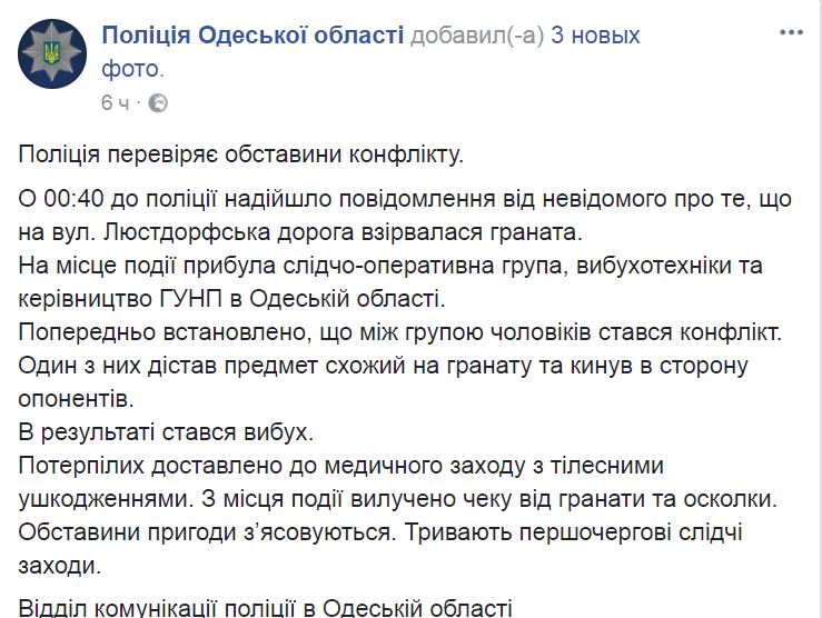 В ночь на 14 сентября в Одессе на улице мужчина взорвал гранату, в результате чего есть пострадавшие. Об этом сообщает отдел коммуникации полиции в Одесской области на своей странице в Facebook.