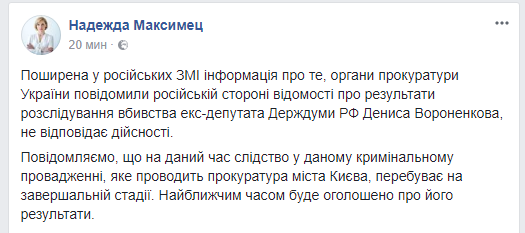Следствие находится на завершающей стадии в расследовании убийства экс-депутата Госдумы РФ Дениса Вороненкова в центре Киева в марте 2017 года, в ближайшее время прокуратура объявит о его результатах. Об этом сообщила в Facebook пресс-секретарь прокуратуры Киева Надежда Максимец.