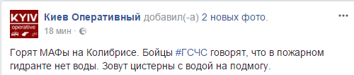 "Бойцы ГСЧС говорят, что в пожарном гидранте нет воды. Зовут цистерны с водой на подмогу", - говорится в сообщении.