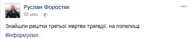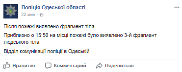 Также советник начальника Главного управления Нацполиции в Одесской области Руслан Форостяк отметил, что найдены "останки третьей жертвы трагедии", которые обнаружены на пепелище.