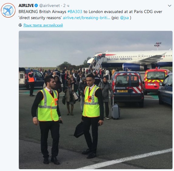 Во Франции в аэропорту "Шарль де Голль" эвакуировали пассажиров самолета British Airways. Об этом сообщает Reuters.