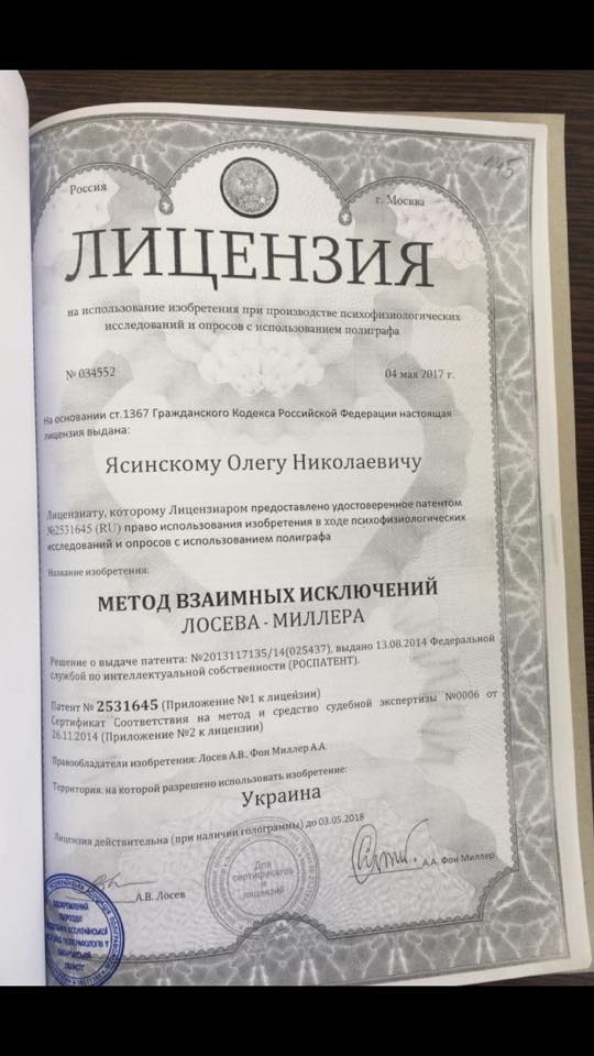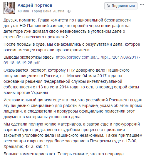 "Оказывается, эксперт, которому ГПУ доверило дело Пашинского получил лицензию в России, в г. Москве 04 мая 2017 года на основании решения Федеральной службы интеллектуальной собственности от 13 августа 2014 года, то есть в период острой фазы войны против Украины. Исключительный цинизм еще и в том, что российский Роспатент выдал эту лицензию специально для работы в Украине, указав об этом прямо лицензии, а следователи и прокуроры официально поместили этот документ в материалы уголовного дела. Мы сделали полную копию материалов, а завтра еще и прокурорский вариант будет представлен в судебном процессе о признании закрытия уголовного дела Пашинского незаконным", - написал он и приложил копию лицензии.