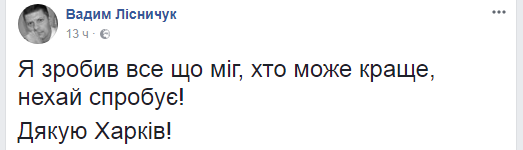 "Я сделал все, что мог. Кто может лучше, пусть попробует! Спасибо, Харьков!", - написал он в понедельник вечером.