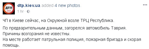 "ЧП в Киеве сейчас, на Окружной возле ТРЦ Республика. По предварительным данным, загорелся автомобиль Таврия", - говорится в сообщении.
