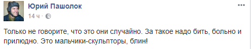 "Только не говорите, что это они случайно. За такое надо бить, больно и прилюдно. Это мальчики-скульпторы, блин!" - написал он и обнародовал фото фрагмента памятника и фото схемы немецкого оружия.