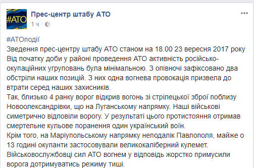В зоне военных действий на Донбассе сегодня, 23 сентября, зафиксировано только два обстрела позиций сил АТО, однако один украинский военный погиб. Об этом сообщается в пресс-центре штаба АТО в Facebook.