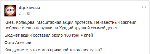 "Неизвестный заклеил лобовое стекло девушки на Hyundai крупной суммой денег. Бюджет акции составил около 100 грн! + клей", - говорится в описании.