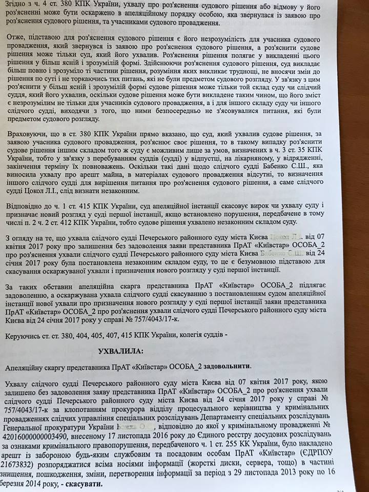 Правда, адвокат Бабич трактует это решение не в пользу оператора. “Никто не отменял решение об аресте оборудования "Киевстар". Да, они выиграли апелляцию, в которой просили от судьи первой инстанции разъяснить свое постановление об аресте оборудования. Но доступ следователям ко всему оборудованию Киевстар с целью получения любой интересующей информации о телефонных разговорах и переписке всех абонентов Киевстар как был, так и остался", - утверждает адвокат в комментарии "Стране".