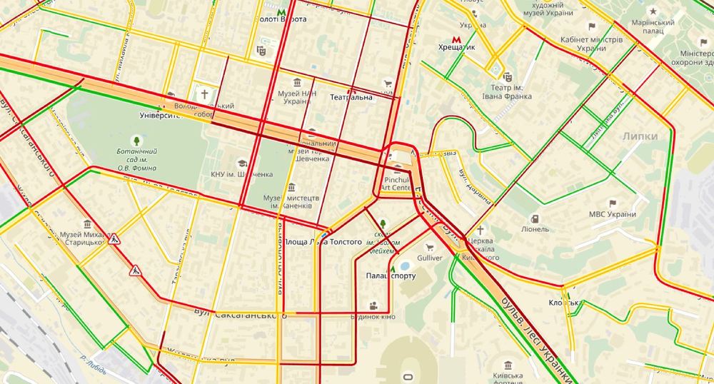 Особенно критичная ситуация с проездом в центре города. Здесь движение не более 3- 5 км/ч как на Крещатике, так и на бульваре Тараса Шевченко, "стоит" Бессарабская площадь, улицы Саксаганского и Жилянская, в обе стороны пробки на улице Владимирской.
