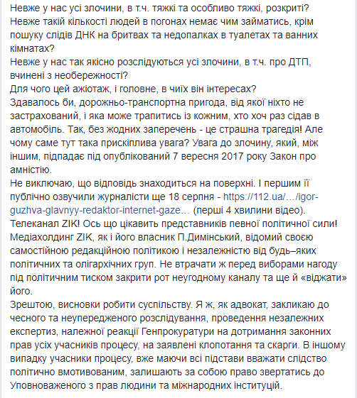По убеждению Лысого, в расследование "вмешалось руководство МВД Украины, в частности, министр Арсен Аваков и его советник Антон Геращенко". Давление адвокат видит в заявлениях о ДТП министра и его советника, а также в том, что уголовное производство по приказу главы МВД забрали у львовских следователей, и передали в Главное следственное управление Нацполиции в Киеве.
