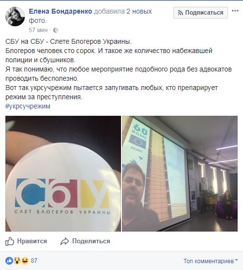На слете украинских блогеров (сокращенно - СБУ) в Киеве, который собрал около 140 человек, также присутствует примерно столько же полицейских и сотрудников СБУ. Об этом на своей странице в в Facebook экс-нардеп Елена Бондаренко, принявшая участие в мероприятии.