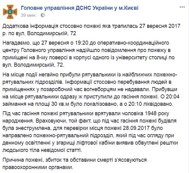 В Киеве после вчерашнего пожара в Институте пищевых технологий на ул. Владимирской спасатели при дневном освещении в пепелище в лифте обнаружили обугленные остатки человеческого тела. Об этом сообщается на странице ГосЧС в Facebook.