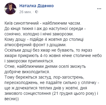 "К концу недели и до следующей среды - солнечно, холодно и ночные заморозки. Кому дождя - подойдет 4 октября в столицу атмосферный фронт с дождями. Поскольку дождя без туч не бывает,  и  так как раз облака прикроют 4 октября ночное столичное небо то заморозки прекратятся. Итак, в ближайшие дни дома смогут хорошо выстыть", - сообщает Диденко.