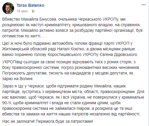 Нардеп от партии УКРОП Тарас Батенко заявил, что в ночь убийства депутата черкасского горсовета Михаила Бинусова взорвали автомобиль еще одного члена УКРОПа - депутата Житомирского облсовета Натальи Кокитко. Об этом Батенко написал в Facebook.