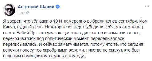 Эдуард Долинский, глава Украинского еврейского комитета: "Завтра годовщина начала убийства еврейской общины Киева в Бабьем Яре. И чем ближе эта дата, тем больше начинает "штырить" упырей. Вождь ОУН публикует пост, что он не против того, что завтра будут почитать жертв Холокоста, но при этом "надо помнить, что там нацисты расстреляли практически весь состав Походной группы ОУН".