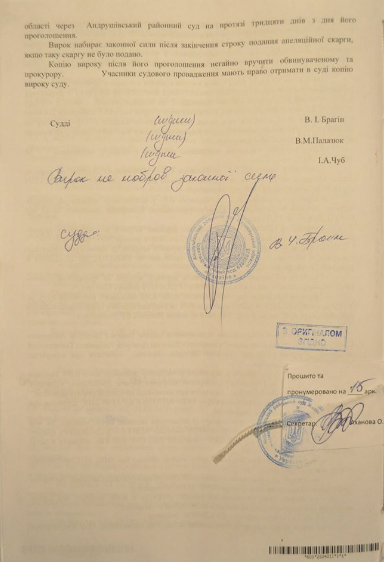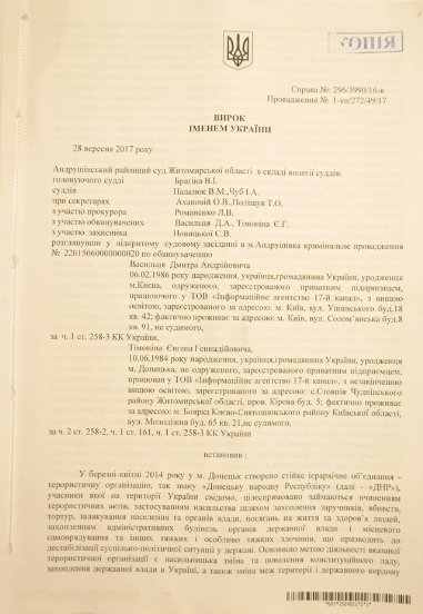 Адвокат Светлана Максимец обнародовала приговор Андрушовского суда по делу журналиста Дмитрия Васильца и оператора Евгения Тимонина. Фото документа она разместила в Facebook.