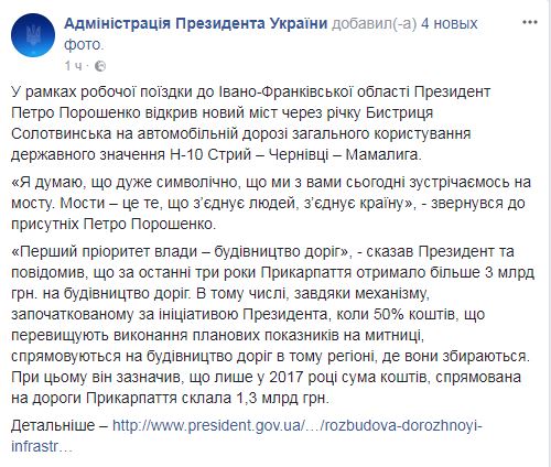 Сегодня президент Петр Порошенко открыл в Ивано-Франковской области новый мост через реку Быстрица Солотвинская. Об этом на своей странице в Facebook сообщает Администрация президента.
