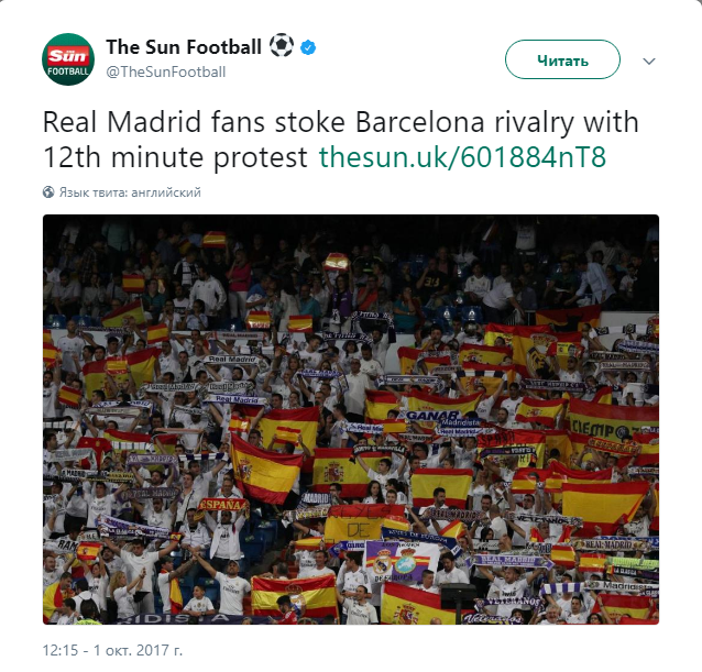 13:39 Вчера фанаты мадридского "Реала" провели свою акцию против каталонского сепаратизма. Во время матча против "Эспаньола" болельщики на 12-й минуте поднялись со своих мест с флагами Испании.