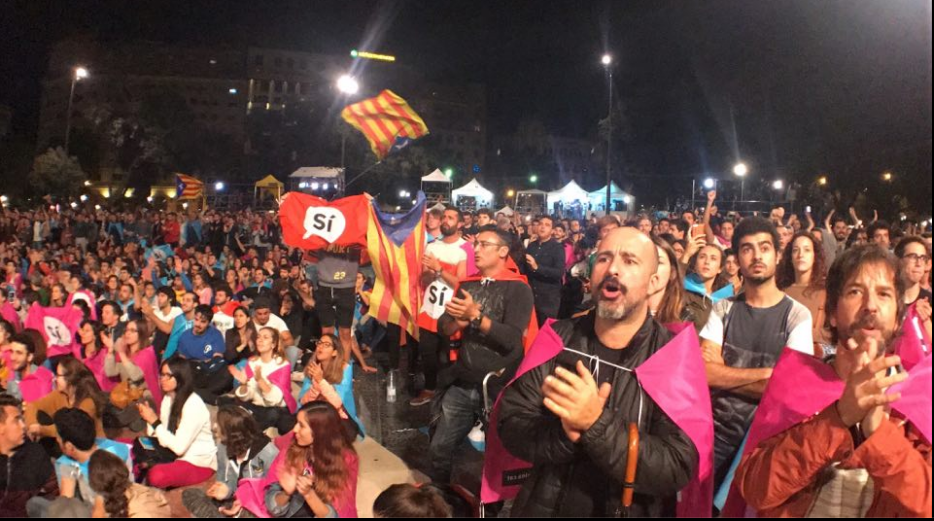 22:30 Наш корреспондент Валерия Ивашкина уже в Барселоне. Сейчас там проходит митинг в поддержку референдума.