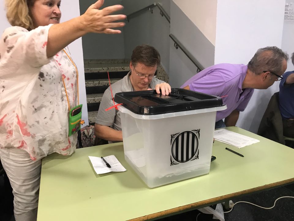 11:30 А где-то голосуют без проблем. Так опускает бюллетень министр иностранных дел Каталонии Рауль Ромева.