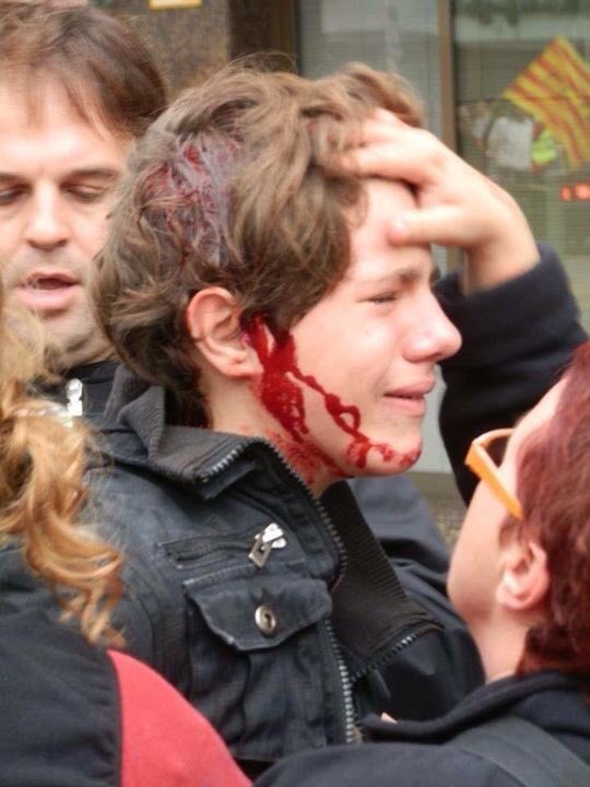 10:39 Окровавленная сторонница референдума, которая дралась с полицейским на видео ниже. Название избирательного участка совпадает с фамилией президента Каталонии - Пуджемонт. Это здание одной из центральных школ, где проходит референдум.