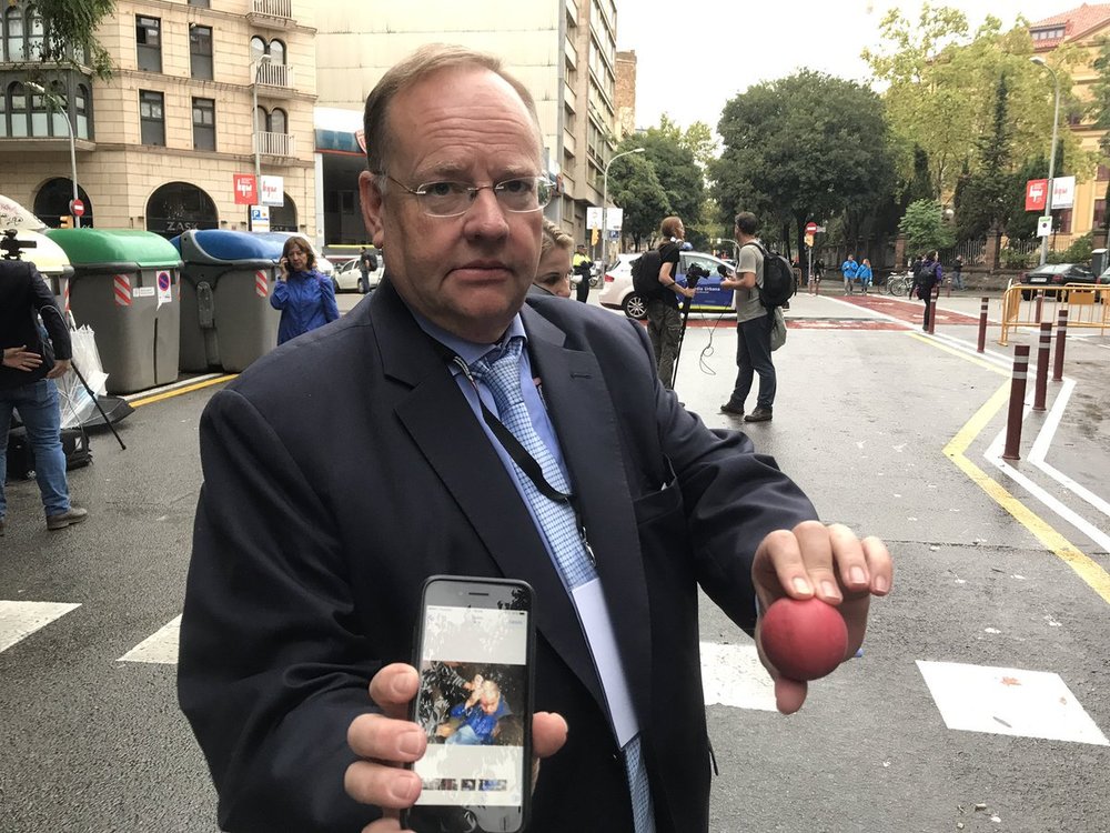 Среди наблюдателей за референдумом оказался член британской Палаты лордов Крис Реннард - он с негодованием демонстрировал резиновую пулю, которыми полиция сегодня обстреливала демонстрантов.