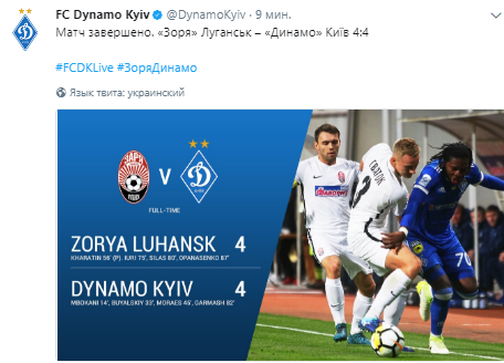 Матч 11-го тура Украинской Премьер-лиги между "Зарей" (Луганск) и "Динамо" (Киев) закончился со счетом 4:4. Об этом ФК Динамо сообщает в Twitter.