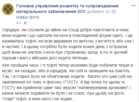 "Офицеры, служившие до войны на Востоке хорошо помнят в чем они ходили и надевали на ноги в повседневной форме одежды. И это назывались туфли, которые всем выдавали по выпуску из института или уже и в части. И в этом нужно было ходить каждый день со страхом, чтобы они не слетели с ноги при строевом шаге, а по их удобной подошве и массе в войсках до сих пор ходят легенды ... Но прошли времена, и те туфли теперь можно будет увидеть только в музее, на складах, или у офицеров, которые себе их оставили на память. Да, и в старых было не обязательно ходить - многие шил себе на заказ по тому же фасону и ГОСТу. А отныне по этому же ГОСТу мы приняли именно такую ​​версию "полуботинок хромовых" и ниже можете сравнить как было и как стало, при этом на фото "старые" туфли, в которых никто не ходил ...", - говорится в сообщении.
