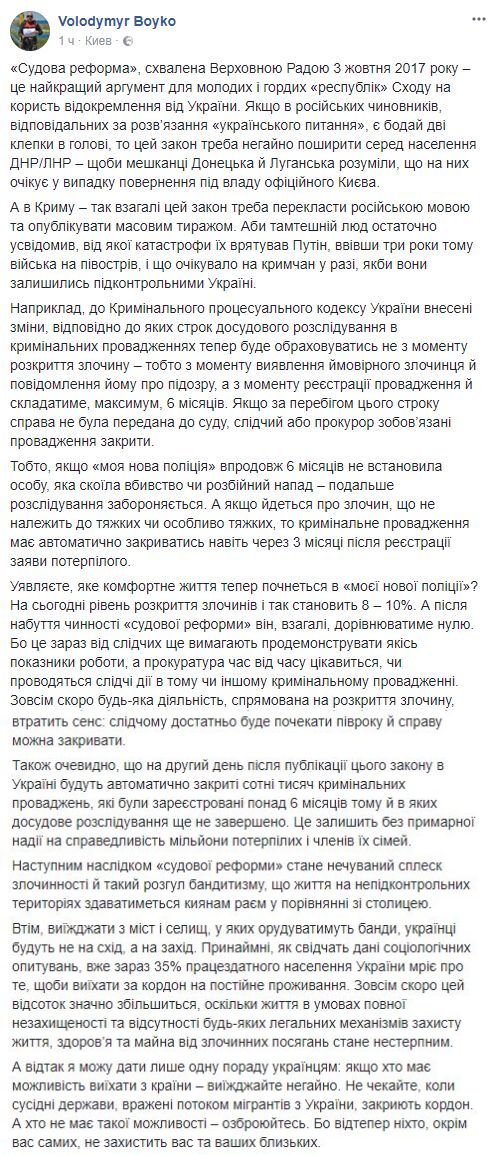 Владимир Бойко, журналист: "Судебная реформа", одобренная Верховной Радой 3 октября 2017 - это лучший аргумент для молодых и гордых "республик" Востока в пользу отделения от Украины. Если у российских чиновников, ответственных за решение "украинского вопроса", есть хоть две клепки в голове, то этот закон нужно немедленно распространить среди населения ДНР/ЛНР - чтобы жители Донецка и Луганска понимали, что их ждет в случае возвращения под власть официального Киева. А в Крыму - так вообще этот закон надо перевести на русский язык и опубликовать массовым тиражом. Чтобы тамошний люд окончательно осознал, от какой катастрофы их спас Путин, введя три года назад войска на полуостров, и что ожидало крымчан в случае, если бы они остались подконтрольными Украине.
