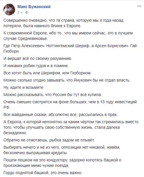 Макс Бужанский, блогер: "Совершенно очевидно, что та страна, которую мы 4 года назад потеряли, была намного ближе к Европе. К современной Европе, ибо то, что мы имеем сейчас, это в лучшем случае Средневековье. Где Петр Алексеевич - Ноттингемский Шериф, а Арсен Борисович- Гай Гизборн. И вершат всё по своему разумению. И никаких робин гудов и в помине. Все хотят быть или Шерифом, или Гизборном.