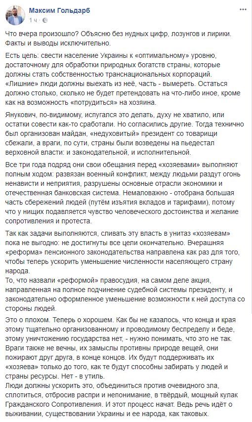 Максим Гольдарб, юрист: "Что вчера произошло? Объясню без нудных цифр, лозунгов и лирики. Факты и выводы исключительно. Есть цель: свести население Украины к "оптимальному" уровню, достаточному для обработки природных богатств страны, которые должны стать собственностью транснациональных корпораций.