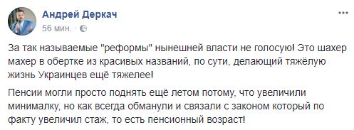 Андрей Деркач, народный депутат: "Это шахер махер в обертке из красивых названий, по сути, делающий тяжелую жизнь Украинцев ещё тяжелее! Пенсии могли просто поднять еще летом потому, что увеличили минималку, но как всегда обманули и связали с законом который по факту увеличил стаж, то есть пенсионный возраст!"