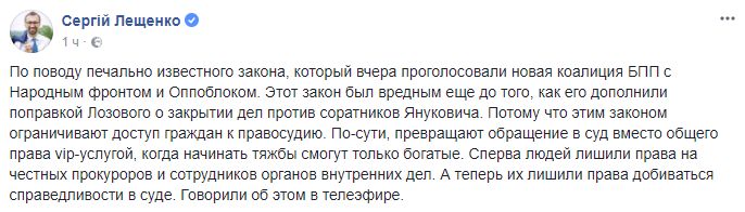 Сергей Лещенко, народный депутат: "По поводу печально известного закона, который вчера проголосовали новая коалиция БПП с Народным фронтом и Оппоблоком. Этот закон был вредным еще до того, как его дополнили поправкой Лозового о закрытии дел против соратников Януковича. Потому что этим законом ограничивают доступ граждан к правосудию. По-сути, превращают обращение в суд вместо общего права vip-услугой, когда начинать тяжбы смогут только богатые. Сперва людей лишили права на честных прокуроров и сотрудников органов внутренних дел. А теперь их лишили права добиваться справедливости в суде".