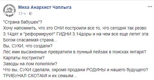 Михаил Чаплыга, политолог, блогер: " "Страна бабушек"? Хочу напомнить, что это ОНИ построили все то, что сегодня так резво 3.14дят и "реформируют" ГИДНИ 3.14доры и на чем все еще летит эта Богом спасаемая страна... Вы ... что создали? Лес ими высаженные превратили в лунный пейзаж в поисках янтаря? Карпаты постригли? Заводы на лом попиляли? Что вы ... сделали, окромя продажи РОДИНЫ и нашего будущего?..."